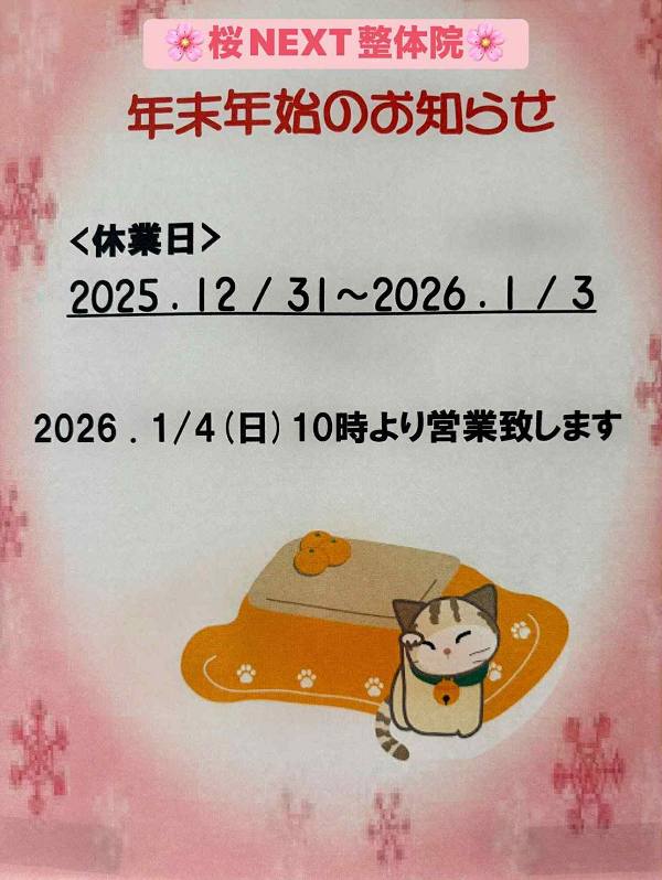 HOME > お知らせ > お知らせ 年末年始休業のお知らせ 2025-12-18 年末年始の休業日をお知らせいたします。 2025年12月31日(水)から2026年 1月 3日(土)まで休業日とさせていただきます。 2026年 1月 4日(日)の午前10時より営業いたします。 🌸桜NEXT整体院では本年もスタッフ一同、12月30日(火)の最終営業日まで身を(30)尽くして取り組んでまいります! Twitter Share Pocket Hatena Pinterest LINE URLコピー -お知らせ